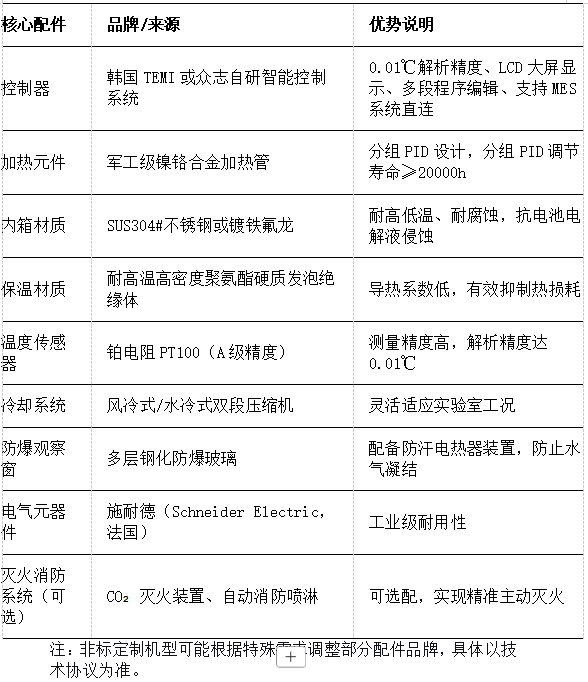 Q10:众志电池防爆型高低温试验箱的核心配件有哪些?采用哪些品牌?